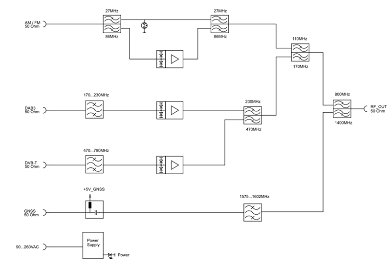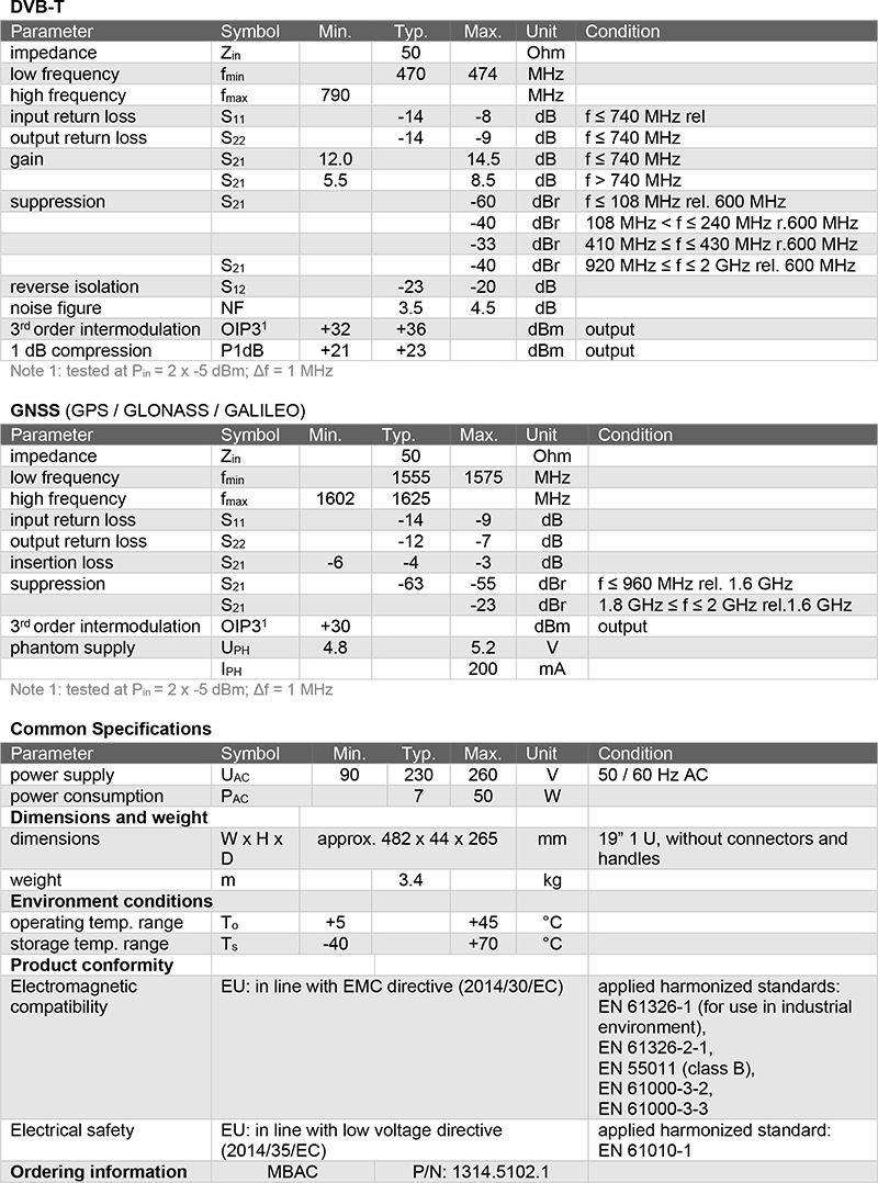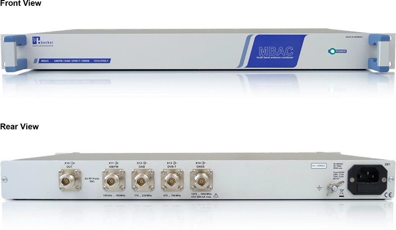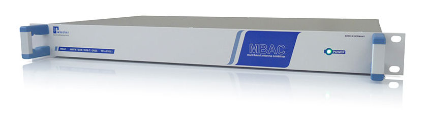 MBAC 為一款多頻段高動態 主動式天線合路器,專為廣播與導航應用設計,具備 4 組獨立輸入通道,分別對應 AM/FM、DAB3、DVB-T 及 GNSS 訊號,並將其整合為單一共用輸出;全機採用 50 歐姆架構,適用於高訊號品質要求之專業廣播分配系統。
