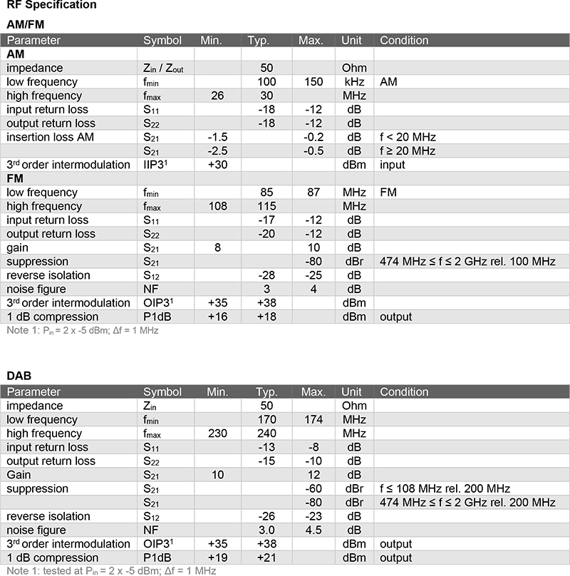 - FM、DAB、DVB-T 通道內建低雜訊、低失真前置放大器