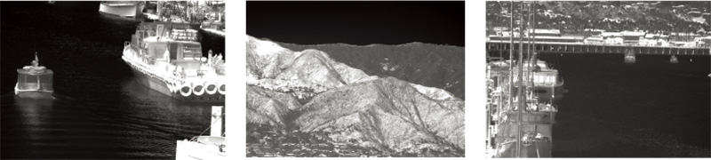 圖中展示了由 IRC800 系列攝影機拍攝的三張紅外線熱影像,由左至右分別為:水面航行的船隻、起伏的山巒地形,以及停泊船隻的港口設施,這些畫面充分展現了該相機具備高靈敏度與超低雜訊的優異觀測與細節捕捉能力 。