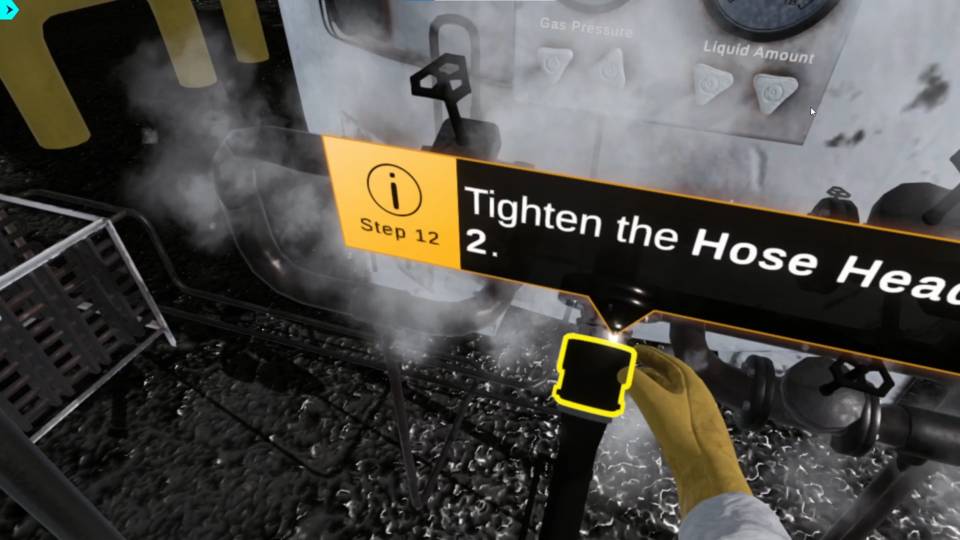 石油安全訓練模擬器中的虛擬實境操作步驟示意,「旋緊軟管接頭(Tighten the Hose Head)」,受訓人員於模擬蒸氣環境中進行實際操作,強調程序正確性與安全細節。