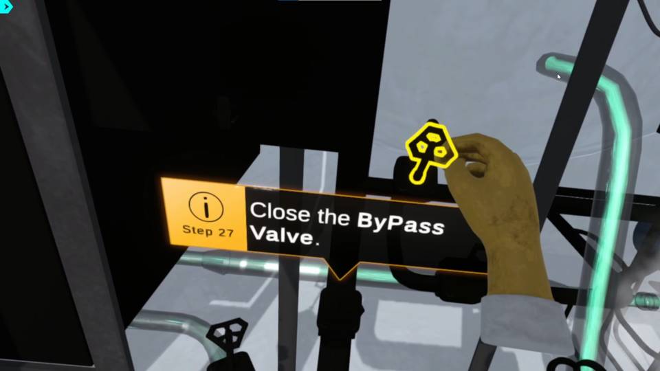 石油安全訓練模擬器中的第27步操作指令:「關閉旁通閥(Close the ByPass Valve)」,使用者於虛擬實境中進行實體轉閥動作,強化對管線系統控制的實作經驗與安全操作意識。