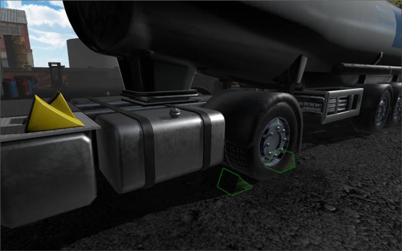 石油安全訓練模擬器中的油罐車側面檢查訓練情境,展示輪胎止滑塊(輪檔)與安全標示的正確擺放位置,用以模擬進場前的車輛安全檢查步驟,強調防滑與防移動措施。