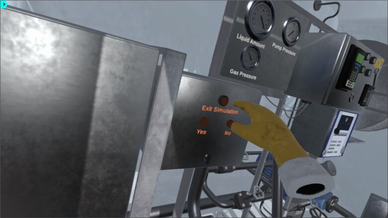 石油安全訓練模擬器中操作人員進行「退出模擬情境(Exit Simulation)」的指令確認,畫面呈現虛擬實境內的控制面板,包含液體容量、泵壓與瓦斯壓力等關鍵指針顯示,用於訓練結束前的系統操作流程與界面熟悉度訓練。