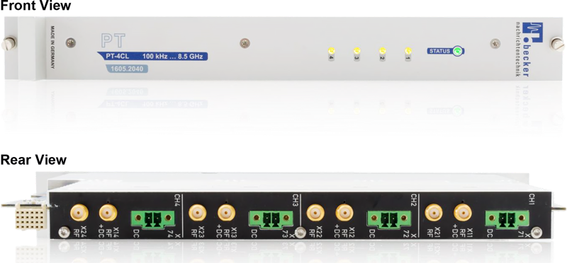 PT-4CL 為專為資訊娛樂元件虛擬電源(Phantom Supply)測試所設計之 高頻寬直流負載模組,具備插槽式模組(Slot-in Module)架構,可無縫整合至 SR6-11C 系統平台中,支援與其他射頻模組平行應用,建構彈性化測試架構;此模組提供 四個獨立射頻通道,每一通道皆內建 超寬頻 BIAS-T(超寬頻偏壓注入器),具備 直流負載電流高達 400 mA 的處理能力,適用於高耗電特性元件之驗證需求。前面板設有 LED 光學指示燈,可即時顯示各通道是否具備虛擬電壓,提升操作便利性與測試安全性;此模組結構堅固、設計緊湊,特別適用於實驗室研發、產線驗證與多模組量測系統環境。