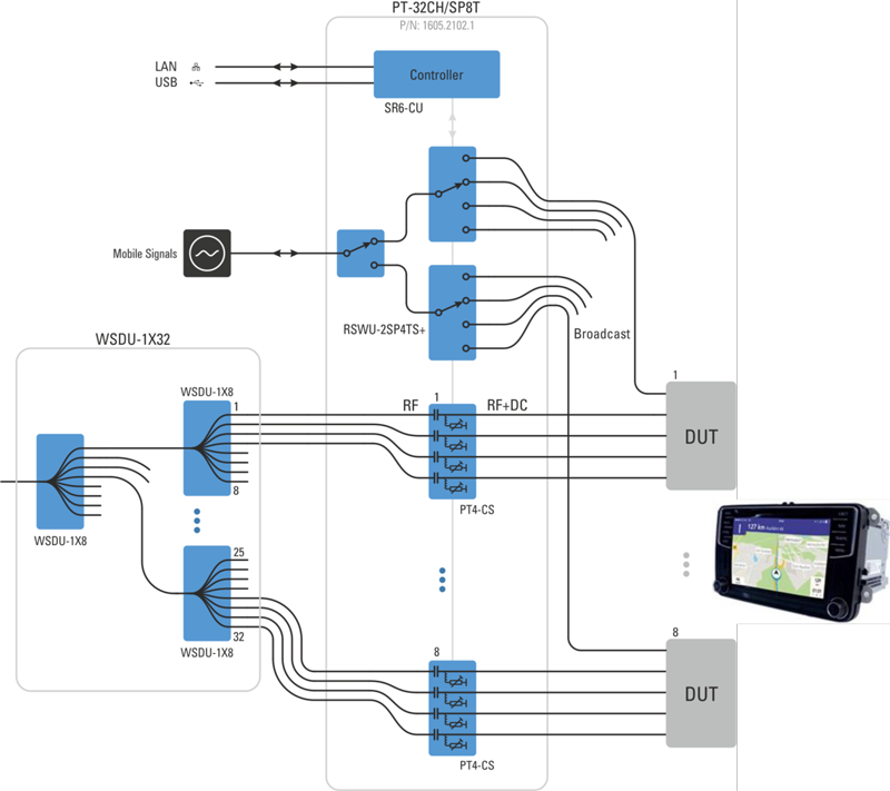 以下方塊圖為一測試架構,應用於八個待測物(DUT),每一待測物透過四個通道接收廣播訊號,並由一個通道接收行動通訊訊號。