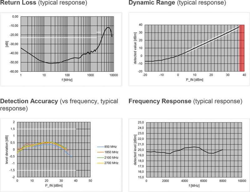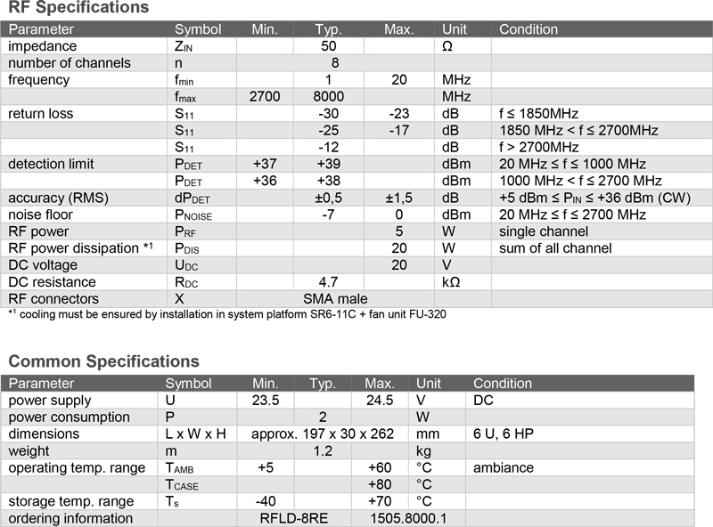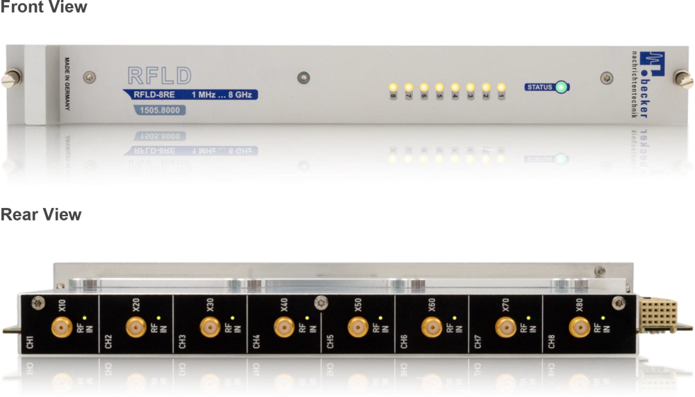RFLD-8RE 是一款支援高射頻功率量測的 八通道實效功率 RMS 射頻電平偵測單元(True Power RMS RF Level Detector),採用標準 50 Ohm 技術架構,具備廣頻支援與高動態範圍等特性;每個通道的典型偵測範圍為 0 dBm 至 +36 dBm(對應 1 mW 至 4 W),可涵蓋 1 MHz 至 8 GHz 的完整射頻頻率範圍,其中 20 MHz 至 2700 MHz 頻段為 Becker 完整規格定義範圍。