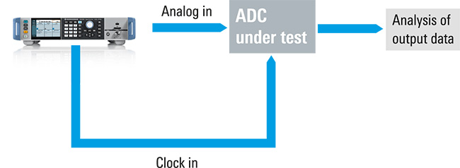 R&S SMA100B 在 ADC/DAC 應用中的實例 — 使用整合了第二訊號源的 R&S SMA100B 進行高達 6 GHz 時脈訊號的 ADC 測試配置