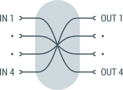 RSWM-4X4 具備 4 組等效輸入與 4 組等效輸出,該矩陣為非阻斷型設計,每個輸出埠可任意連接至任一輸入埠,亦可將一個輸入埠同時路由至多個輸出埠而不影響傳輸品質。