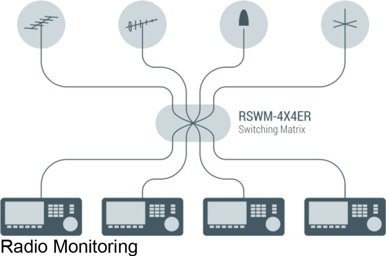 本應用範例展示一組20 MHz 至 8000 MHz 頻率範圍之無線電監測系統,搭配 4 支天線與 4 台接收器,所有接收器皆可完整存取任一天線,不影響訊號品質。