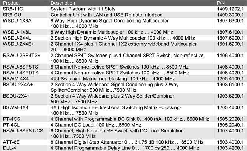 SR6-CU 控制器插槽模組提供 LAN 與 USB 遠端介面,並搭配圖形化使用者介面,支援快速配置與操作射頻開關模組、切換矩陣等裝置;指令集會依據系統內安裝模組動態擴展,具高度彈性與可擴充性。