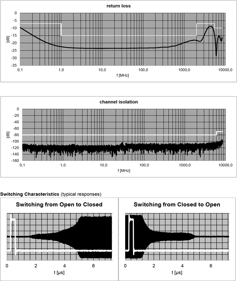 RSWU-8SPSTS 為一款高性能、具備八通道的 SPST 單刀單擲開關(SPST, Single Pole Single Throw),支援極寬頻率範圍自 100 kHz 至 8500 MHz,符合 50 歐姆系統架構,適用於多種射頻訊號切換應用;所有通道皆採用非反射型(Non-reflective)設計,即使在開路狀態下亦提供終端阻抗,能有效抑制訊號反射與多餘干擾,提升系統整體穩定性與訊號品質。