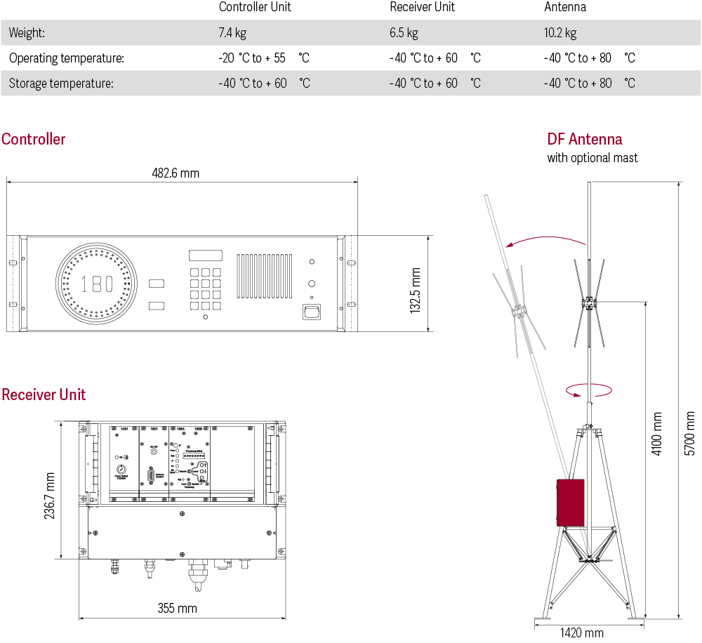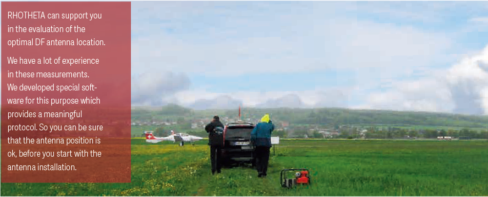 RHOTHETA 將 DF 電子裝置區分為兩個部分,其中一部分為接收單元(Receiver Unit),內含天線控制電子電路與接收器,RHOTHETA 特別設計此接收單元,使其可安裝於室外、靠近 DF 天線的位置,並可整合於天線桅桿結構中的小型機箱內;另一部分為控制單元(Control Unit),包含 DF 電子裝置,則可安裝於塔台內、控制人員所在的位置;兩者之間以一條標準電話線(3 對導線)連接。