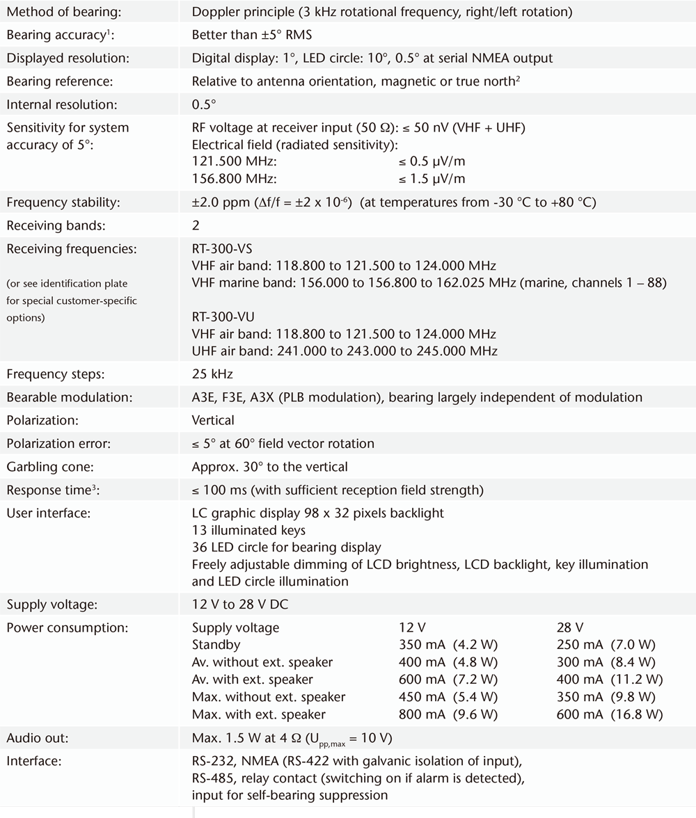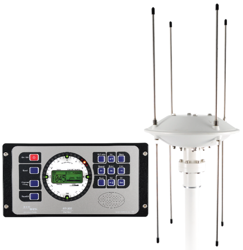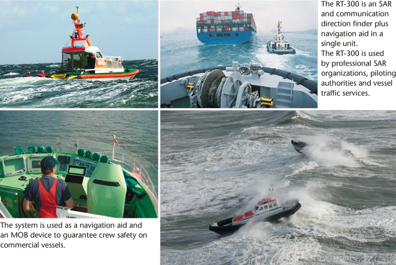 RT-300 是一款多用途雙頻測向儀,不僅能接收 121.5 MHz 頻率的緊急訊號,還能接收海事頻段的語音通訊,該設備專為海上或陸地的移動作業以及陸上移動作業而開發,RT-300 同時是一款 SAR(搜救)與通訊測向儀,也可作為導航輔助設備。當海事頻段處於使用狀態時,系統會自動監測 121.5 MHz 頻率;RT-300 在接收靈敏度和測向精度方面亦樹立了新的標準,精密的演算法提供快速且穩定的數據顯示。