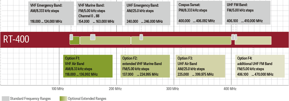 - 支援所有關鍵緊急頻率,包括 121.5 MHz、243 MHz 及 Cospas-Sarsat (406 MHz)