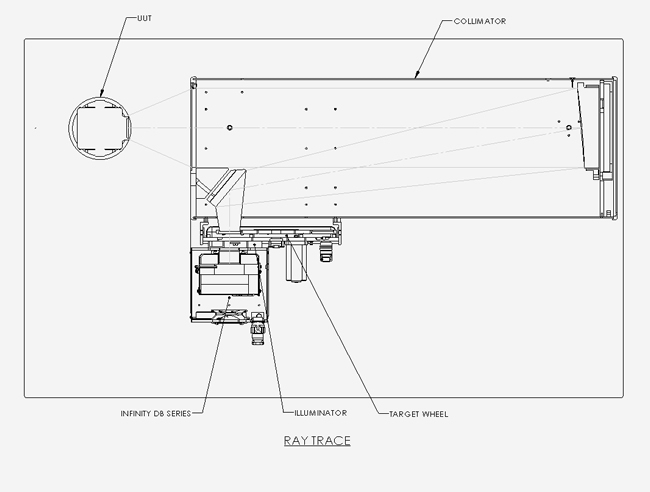 此光線追跡圖展示了紅外線準直測試系統的光學路徑,來自 Infinity DB 系列(黑體)的紅外輻射,可選擇性地通過目標輪上的圖案,並結合照明器光源,進入大型準直儀;準直儀將光源成像於無窮遠處,產生均勻的平行光束射向待測物 (UUT) 的入光孔,用於模擬遠距離目標以進行精確校準或特性分析;此圖清晰呈現了從輻射源到待測物的能量傳遞路徑與光束準直過程。