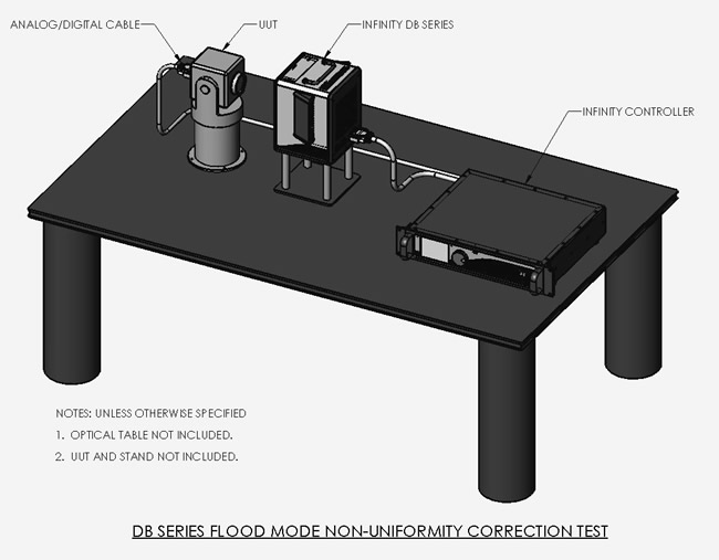 此圖展示 SBIR Infinity DB 系列差分黑體進行泛光模式非均勻度校正 (NUC) 的標準測試配置,圖中標示了待測物 (UUT)、Infinity DB 系列黑體及 Infinity 控制器,透過纜線連接。此設置用於紅外線感測器校準,確保其響應均勻性。