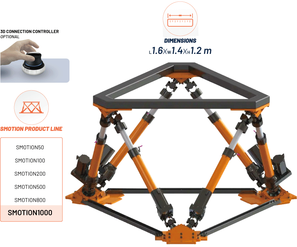SMotion1000 是一款六自由度(6DOF)運動平台,專為各種高科技應用提供精準的運動與控制。具備1,000 kg的負載能力,適用於多種產業應用。