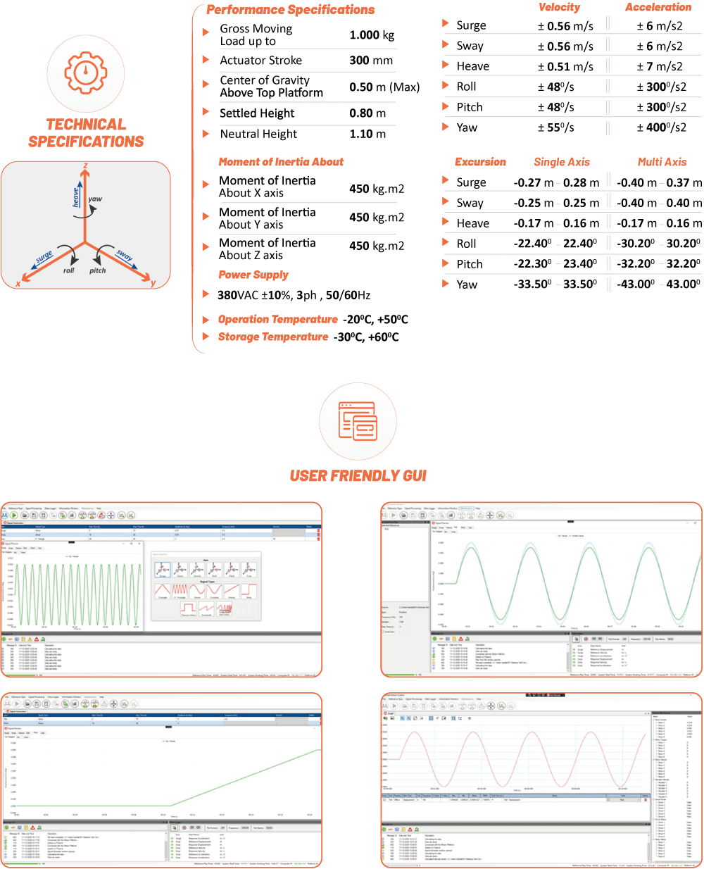 - 保留與標準版 SMotion1000 相同的性能特性,包含縱移(Surge)、橫移(Sway)、升降(Heave)、翻滾(Roll)、俯仰(Pitch)與偏航(Yaw),以及加速度與慣性矩。