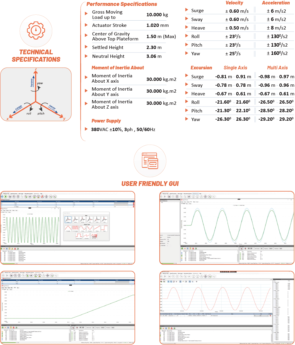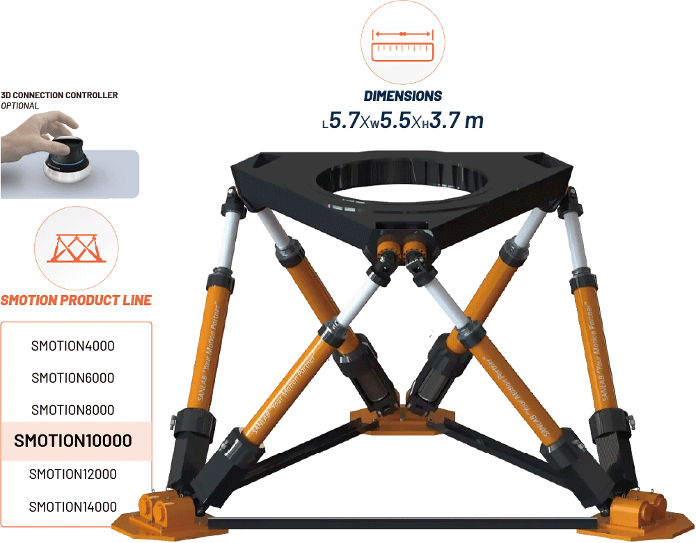 SMotion10000 是一款先進的 6DOF 運動平台,專為高精度運動與控制設計,適用於各類高科技應用。其最大負載能力達 10000 公斤,能夠適應多種行業需求,提供卓越的解決方案。