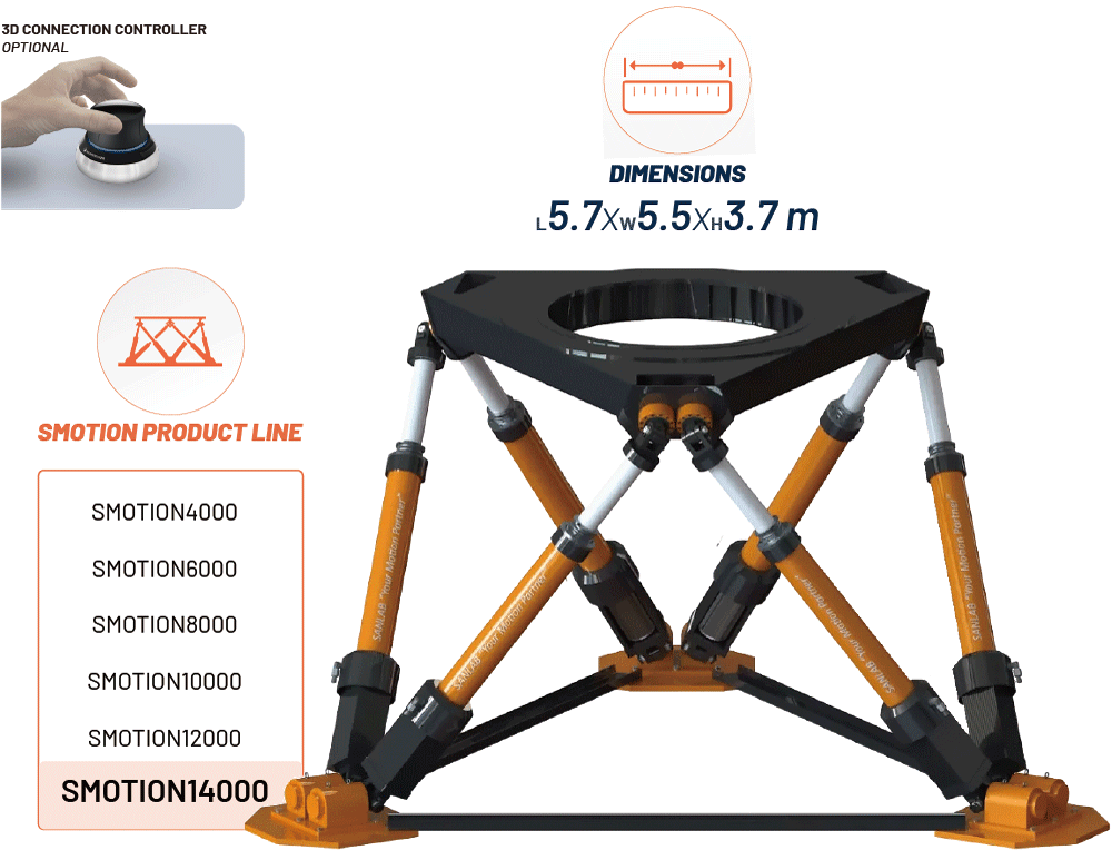 SMotion14000 是一款先進的 6DOF 運動平台,專為各種高科技應用提供精確的運動與控制;其負載能力達 14000 公斤,使其成為適用於多個產業的多功能解決方案。