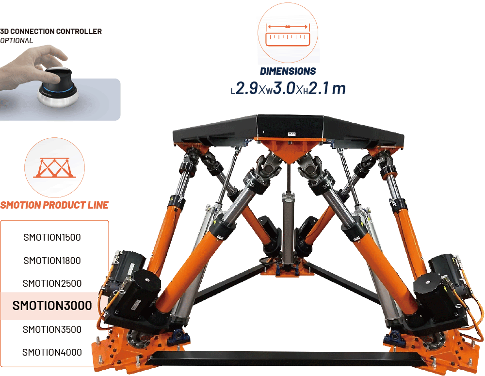 SMotion3000 是一款最先進的 6DOF 運動平台,專為高精度運動控制設計,適用於各類高科技應用,其最大承載能力達 3000 公斤,適用於多種產業需求。