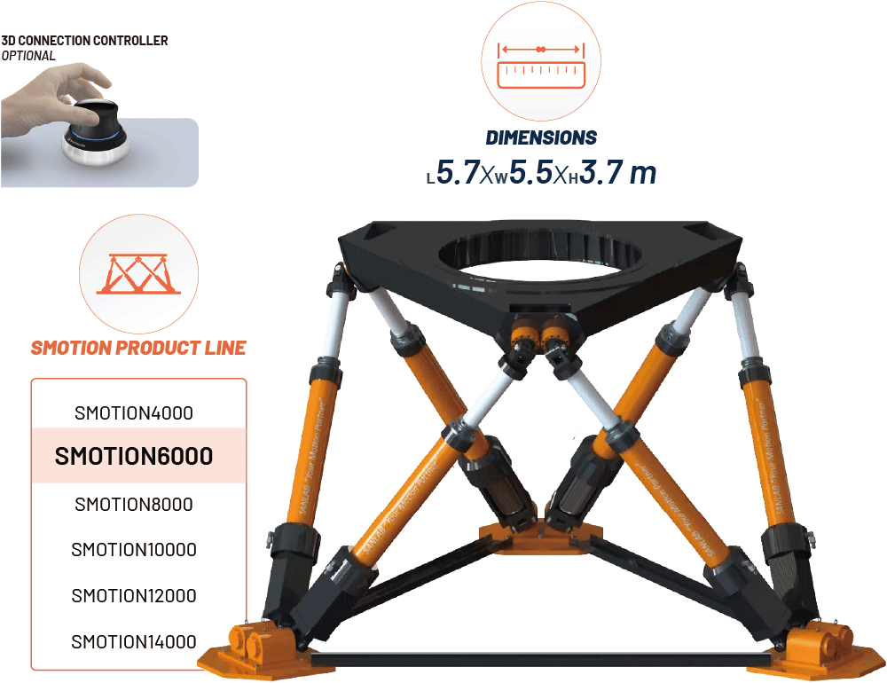 SMotion6000 是一款先進的 6DOF 運動平台,專為各類高科技應用提供精確的運動與控制能力,其最大負載能力達 6000 公斤,適用於多種產業,提供靈活的解決方案。