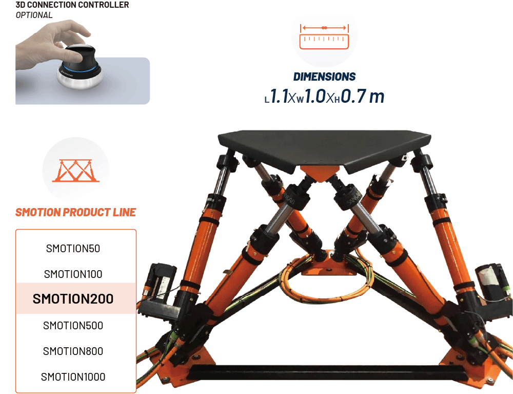 SMotion200 是一款先進的六自由度 (6DOF) 運動平台,專為各種高科技應用提供精確的運動控制。其卓越的載重能力可達 200 公斤,使其成為多種產業的通用解決方案。