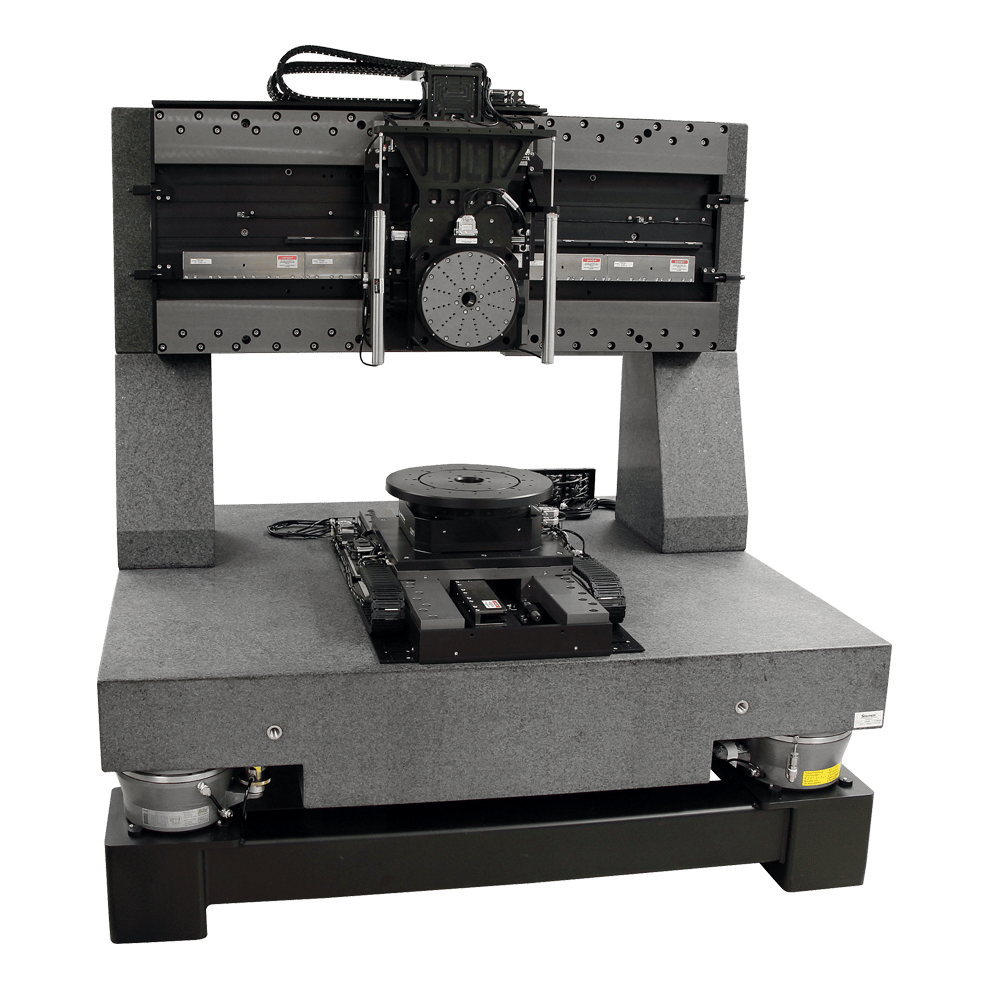 Split-Axis 空氣軸承系統 (Split-Axis Air Bearing System) 是一款專為 超高精度運動控制 設計的大型格式運動平台,確保工作點誤差低於 1 µm;系統採用 XYZ 線性空氣軸承 與 雙旋轉空氣軸承平台,搭配 Aerotech 運動控制器,實現五軸協同控制;為了降低外部擾動,該系統配備 空氣隔離系統 及 鋼製焊接結構,確保長時間運行的穩定性。