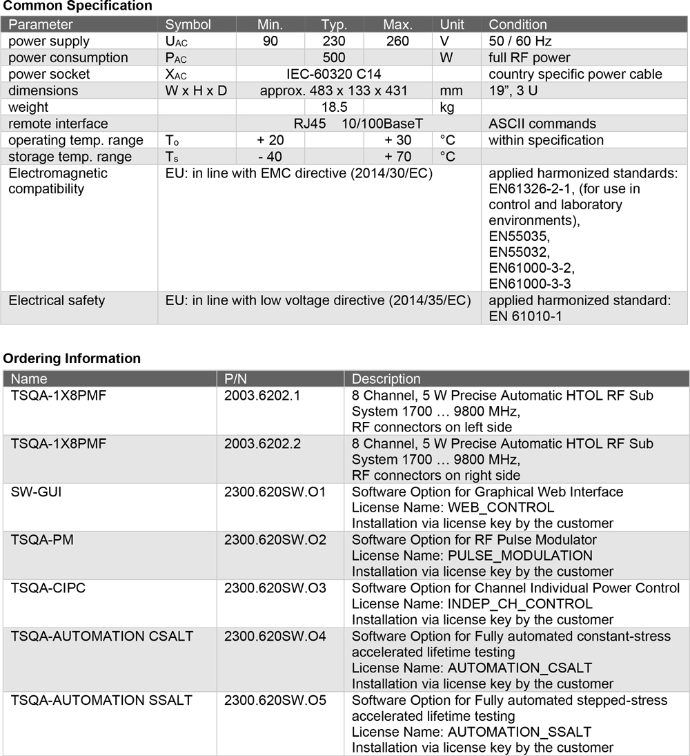 HTOL 與功率壓力測試對射頻系統的要求極高,特別是在多通道輸出時,須確保每一路皆能長時間穩定且精準地提供功率輸出;TSQA-1X8PMF 是一款小型化、自動化的 HTOL 射頻測試子系統,支援 50 ohms 技術,涵蓋寬廣頻率範圍(1700~9800 MHz),非常適合應用於先進射頻元件的可靠度測試;每個輸出通道可提供最高 8 W 的穩定功率,並內建 ALC 機制,確保長時間輸出功率的精準與穩定。