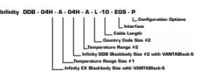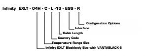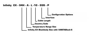 以下為一個 4 吋 EXLT Infinity 低溫型號的訂購範例,其規格包含 VANTABLACK® S-IR 高發射率塗層、IEEE 488 GPIB 通訊介面、115V/60Hz 美國電源、-40˚C 至 +100˚C 溫度範圍、10 英呎纜線,此範例無額外配置選項: