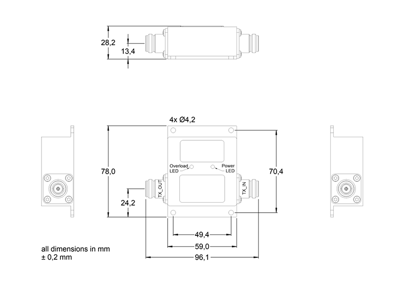 - 雙色光學 LED 狀態指示燈,清楚顯示電源狀態與 TX 過載情形,便於維護與診斷