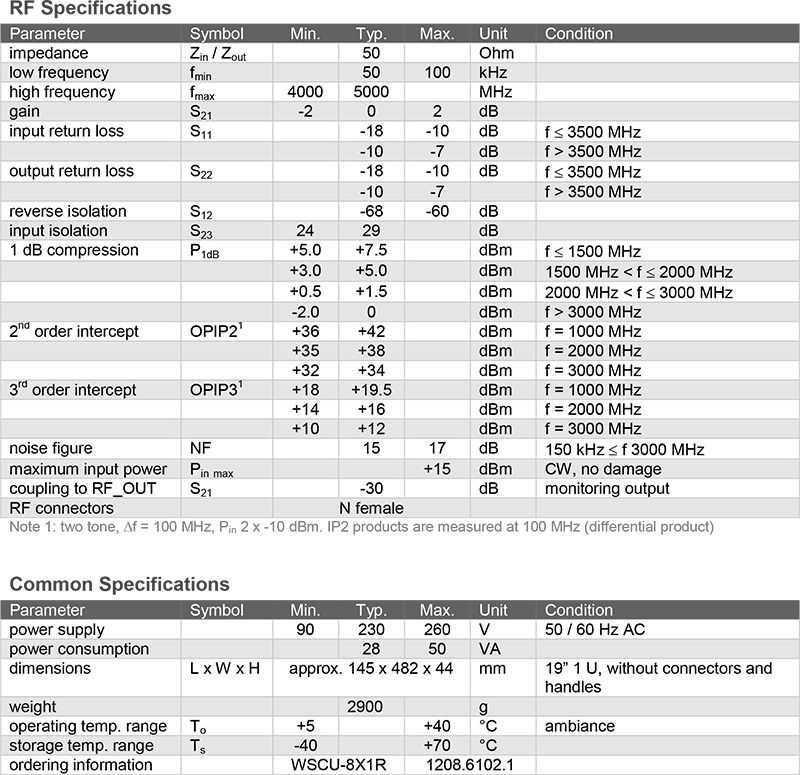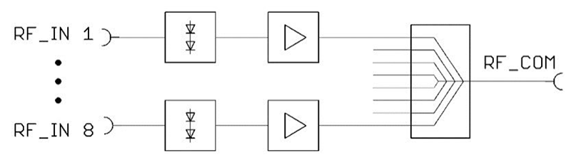 WSCU-8X1R 的 8 個射頻輸入埠均內建寬頻低雜訊放大器,具備高動態範圍,透過此設計,所有輸入訊號在合路後可於共用輸出埠輸出,訊號等級無任何損失,所有輸入與輸出埠皆採用 N 型母頭(N female)連接介面,確保連接穩定且相容性高。