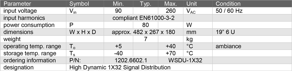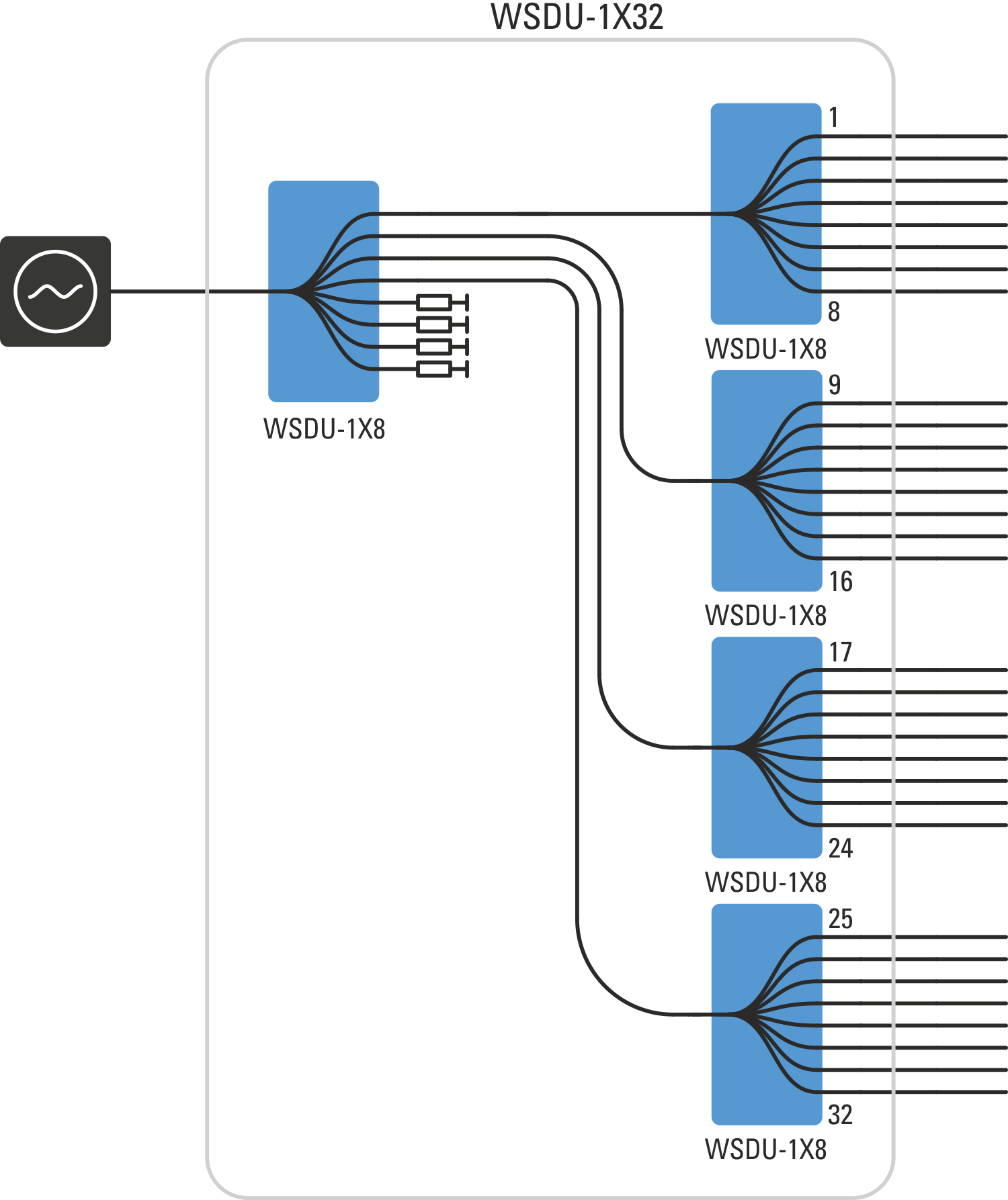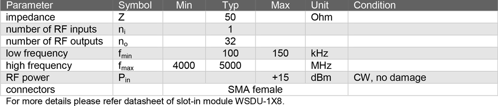 RF 輸入訊號透過具備寬頻與低雜訊特性的放大器級進行放大,並保有寬動態範圍特性,因此輸入訊號能以 無電平損耗的狀態複製至 WSDU-1X32 的 32 個輸出端,所有輸入與輸出皆採用 SMA 母接頭(SMA female connector)。