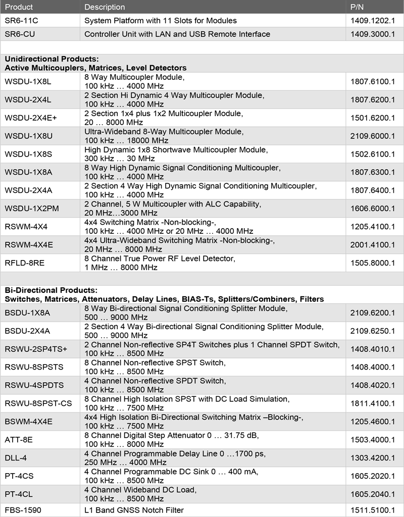 此模組(WSDU-1X8A)設計用於整合至 SR6-11C 系統平台中,SR6-11C 提供 11 個模組插槽,可配置多種功能模組,包括射頻開關(RF Switch)、矩陣模組、多工耦合器(Multicoupler)、衰減器、BIAS-T 電源注入模組、等級偵測器、以及用於訊號調整的雙向分波/合波器(Bi-directional Splitters/Combiners),並搭配控制模組進行集中管理。