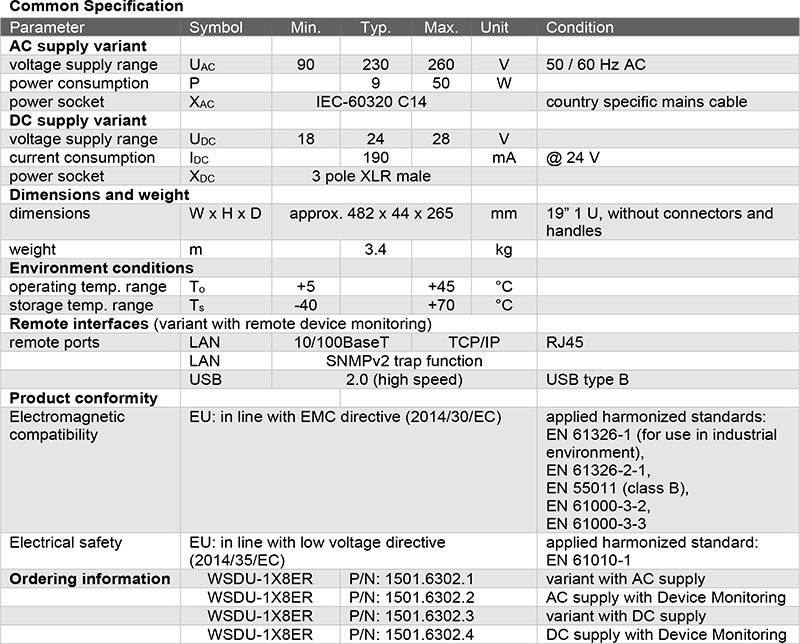 WSDU-1X8ER 提供基本光學健康狀態指示功能,可即時反映設備運作情形,針對進階系統整合需求,另提供具備 LAN 與 USB 遠端監控介面之版本,可透過 ASCII 字串查詢以下內部狀態參數: