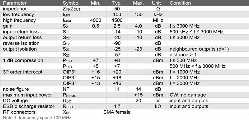 射頻(RF)輸入訊號透過一組寬頻低雜訊放大器進行放大處理,該放大器具備寬動態範圍,因此輸入訊號在分配至各輸出埠後,仍可提供約 3 dB 增益;RF 輸入與八組 RF 輸出皆採用 SMA 母接頭,並配置於模組後側。