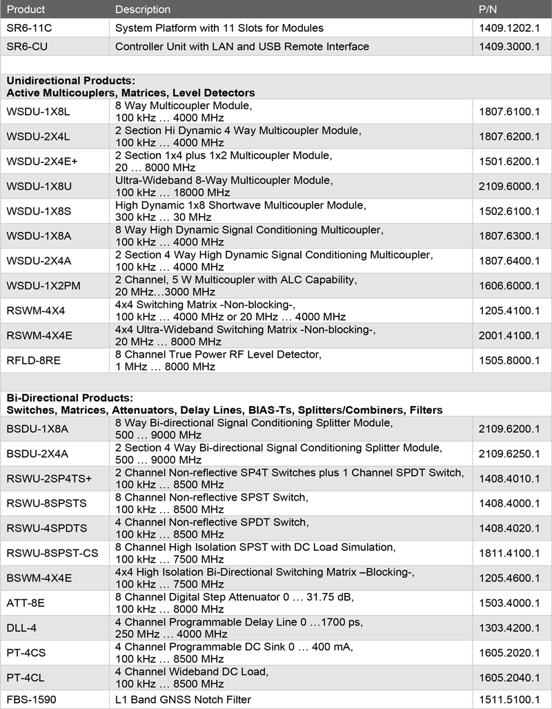 WSDU-1X8L 模組專為整合至 SR6-11C 系統平台而設計;SR6-11C 提供多達 11 組模組插槽,可用於配置各類射頻模組,例如:射頻開關(RF switches)、訊號矩陣(matrices)、多路耦合器(multicouplers)、衰減器(attenuators)、BIAS-T 模組、電平偵測器(level detectors)、雙向分波/合波器(bi-directional splitters/combiners)等訊號調理模組,並可透過控制器模組進行集中管理;若需進行模組狀態監控,必須搭配使用 SR6-CU 控制器單元。