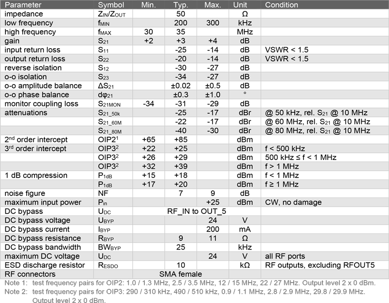 此模組採用低雜訊且高動態的放大器設計,使輸入訊號可在八個輸出埠上以等級無損耗方式輸出,所有射頻埠均使用 SMA 母頭連接器,設置於模組後方。