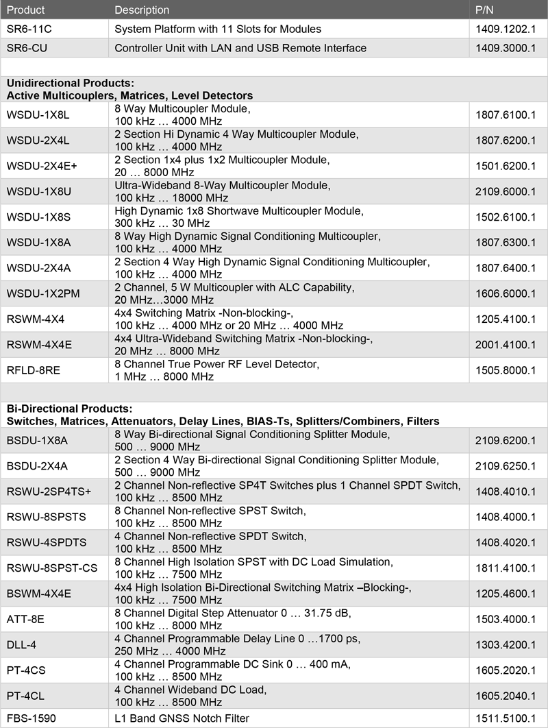 此模組運作頻率範圍涵蓋自 100 kHz 至超過 4000 MHz,支援 AM、FM、DAB、GNSS(GPS、Galileo、GLONASS、Beidou)等全頻段應用,採插槽式模組設計,預設整合於 SR6-11C 系統平台,並支援 USB / LAN 遠端控制,搭配 SR6-CU 控制器可實現即時狀態監測與節能待機操作,為高可靠性通訊與量測系統打造彈性且高性能的訊號核心分配解決方案。