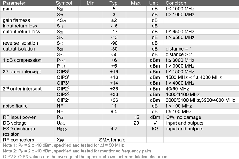 每組射頻輸入訊號皆透過寬頻低雜訊放大器(LNA)進行放大處理,並具備寬動態範圍,使得訊號在輸出埠分配時不僅無損失,反而具有可觀的訊號增益。模組後方配置 SMA 母座連接器作為 RF 輸入與輸出介面,便於整合至量測平台。