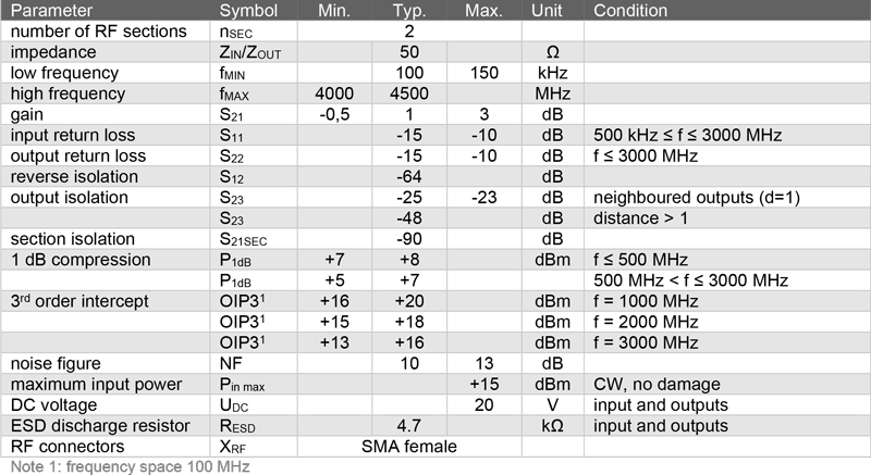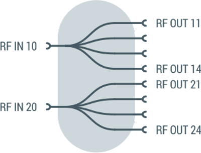 RF 輸入訊號透過寬頻低雜訊放大器進行放大處理,並具備高動態範圍;因此,分配後的每組輸出訊號可在各區段的四個輸出埠上提供約 1 dB 增益,RF 輸入與輸出皆配置於模組背板,並採用 SMA 母座連接器。