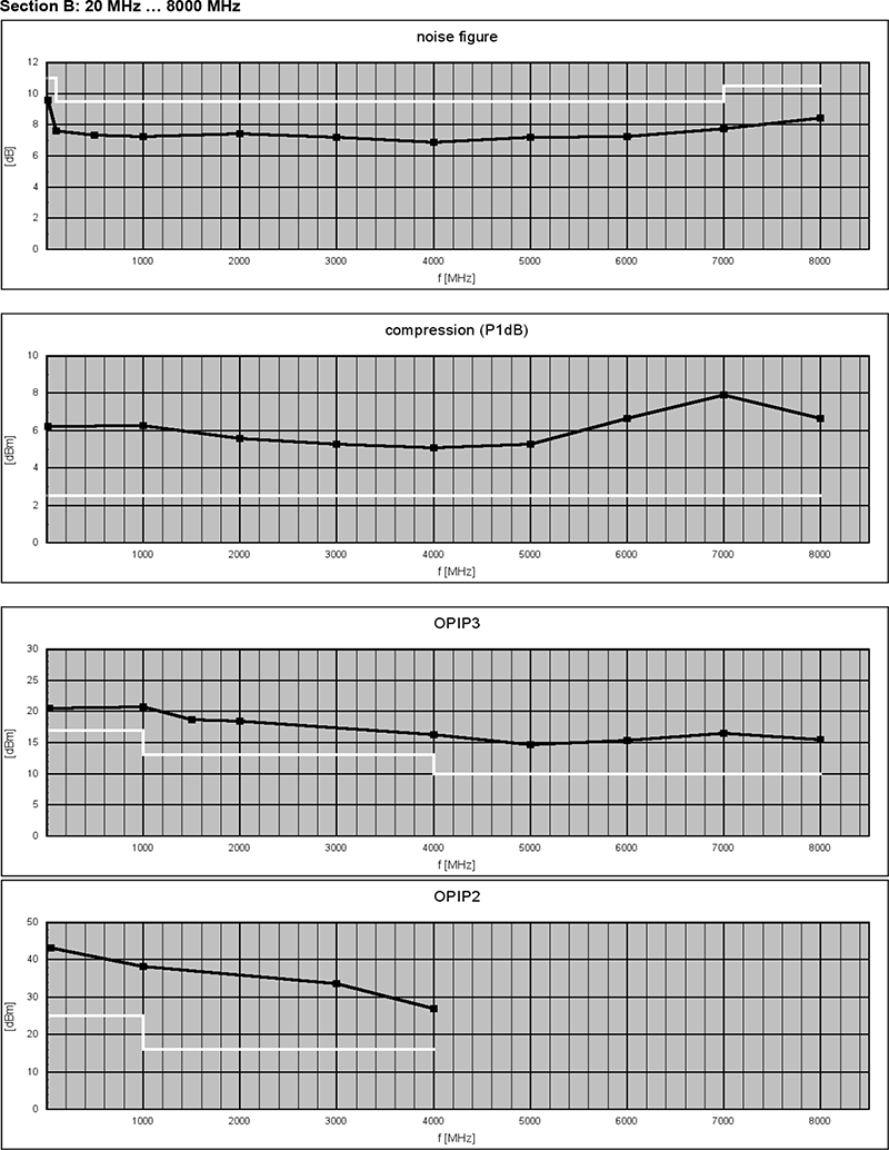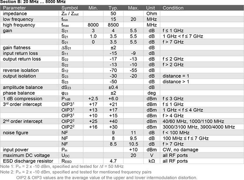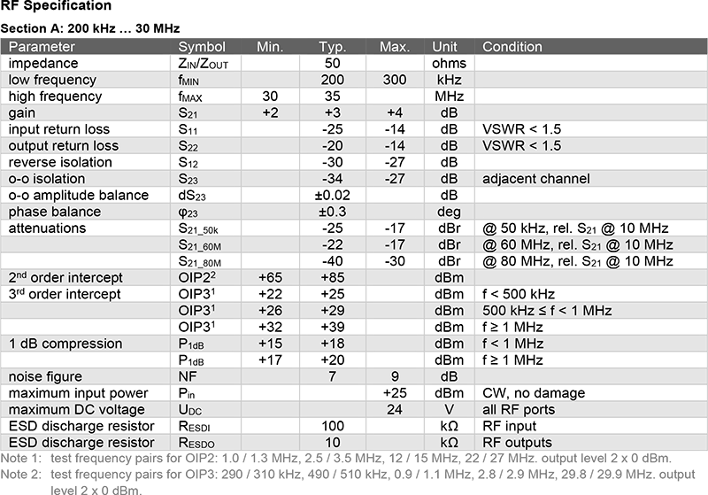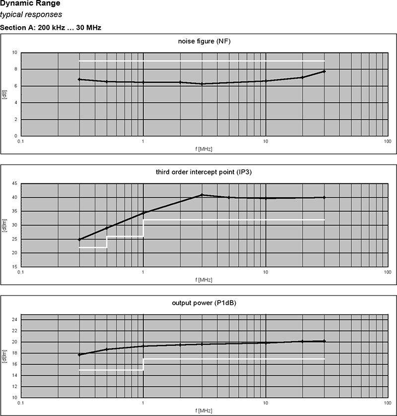 - A 區段針對短波訊號應用進行優化,提供極高的動態範圍與線性放大能力;