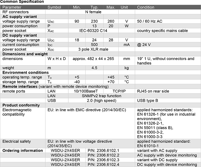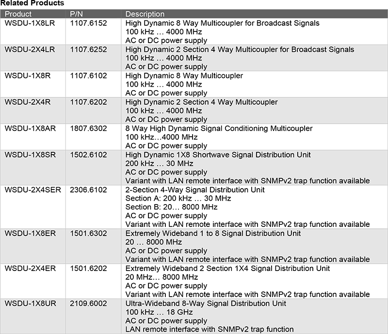 WSDU-2X4SER 為一款超寬頻分配器(Multicoupler),具備兩組獨立運作的射頻(RF)處理區段,每個區段皆可將一組共用輸入訊號,無等級損失地分配至四組輸出埠。